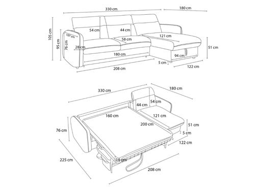 300/330 x 180 x 95-105 cm (selon les positions des tĂȘtiĂšres). - Surface de couchage :