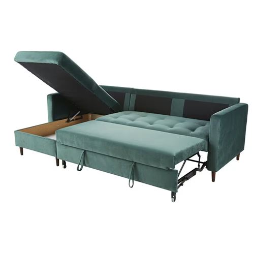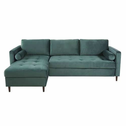 Le canapé d'angle Olivia est un excellent choix pour ceux qui veulent allier esthétique et praticité. Son velours vert, son angle réversible et son couchage d'appoint en font une pièce à la fois chic et fonctionnelle. Que ce soit pour un appartement cosy ou un salon spacieux, il saura trouver sa place et répondre à vos attentes.