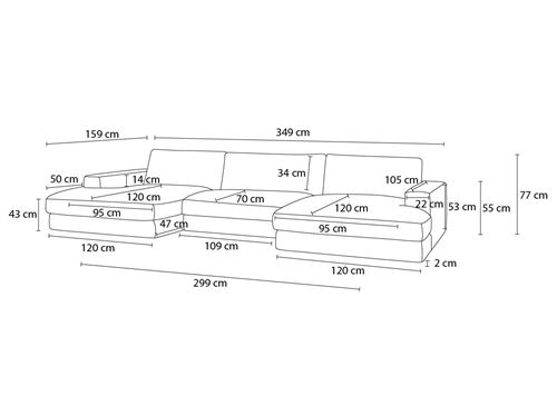 Avec ses 349 cm de longueur, il propose assez d'espace pour accueillir plusieurs personnes tout en restant adapté aux salons de taille moyenne.