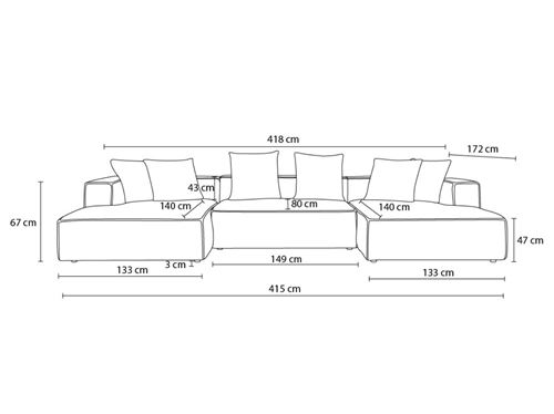- Profondeur méridienne : 140 cm (sans coussins) / 120 cm (avec coussins)