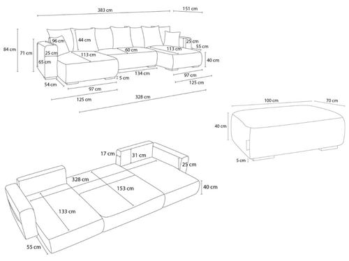 - Dimensions générales : Longueur : 383 cm | Largeur : 151 cm | Hauteur avec coussins : 95 cm.